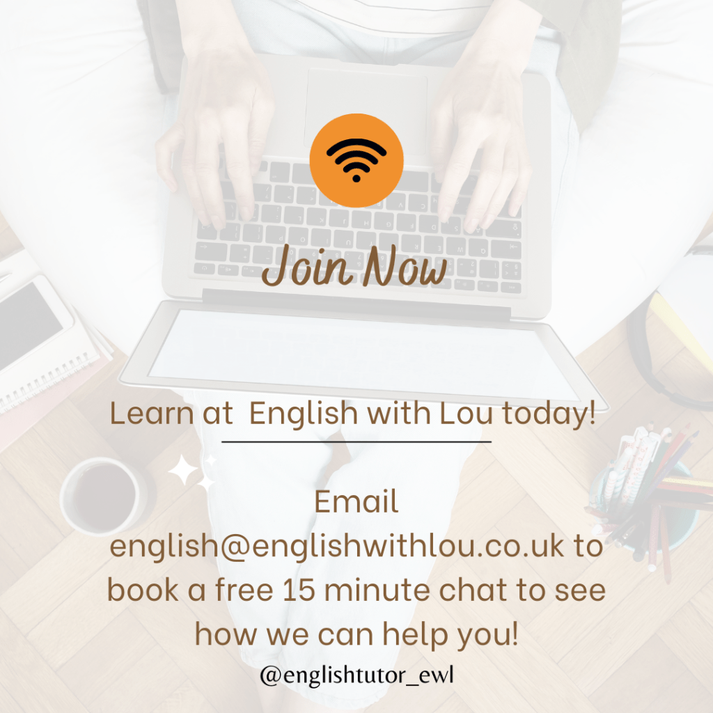 For a free 15 minute chat about your English needs, email the following information to: english@englishwithlou.co.uk
